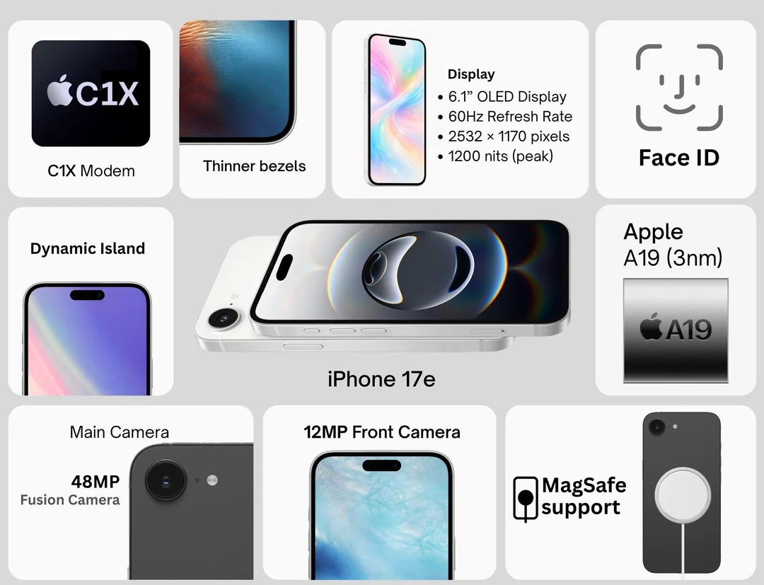 Podle reportu z 9to5Mac bude iPhone 17e vybaven čipem A19, což je upgrade oproti A18 v předchozím modelu. Tento čip slibuje vyšší výkon a lepší energetickou efektivitu. Další klíčovou změnou je modem C1X od Apple, který nabízí až dvojnásobnou rychlost oproti původnímu C1 v iPhone 16e. K tomu přistupuje sítový čip N1 pro Wi-Fi, Bluetooth a Thread konektivitu, což zlepší celkovou bezdrátovou výkonnost.